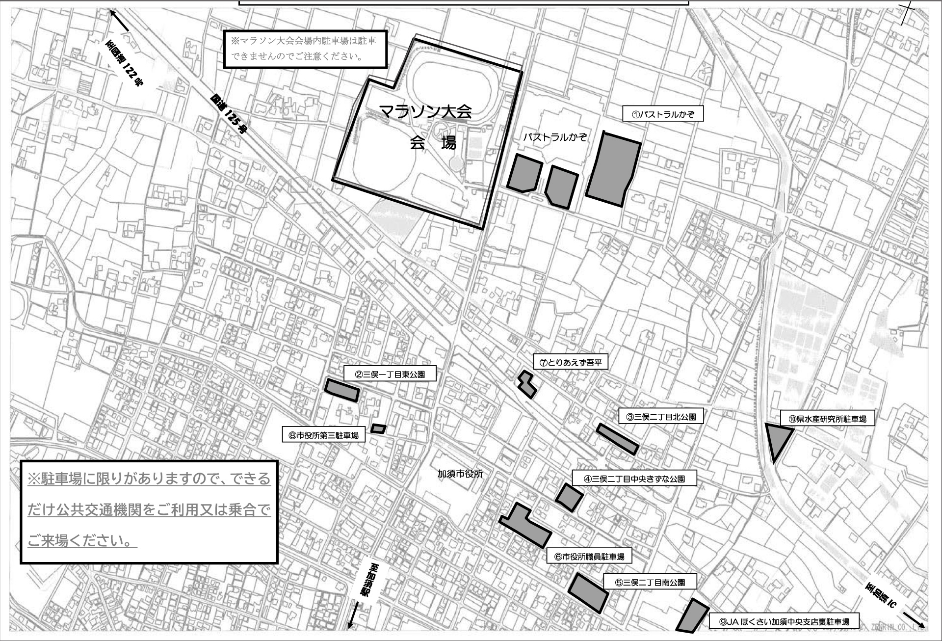 駐車場に限りがありますので、できるだけ公共機関をご利用ください。